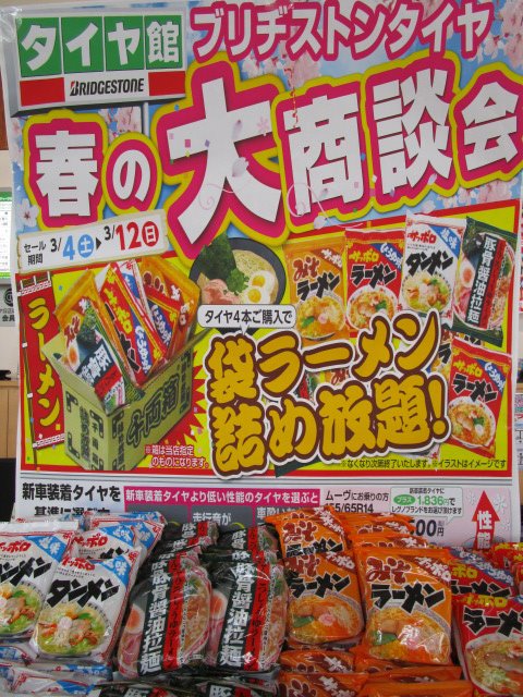 タイヤ4本お買い上げで袋ラーメン詰め放題ですよ!!
