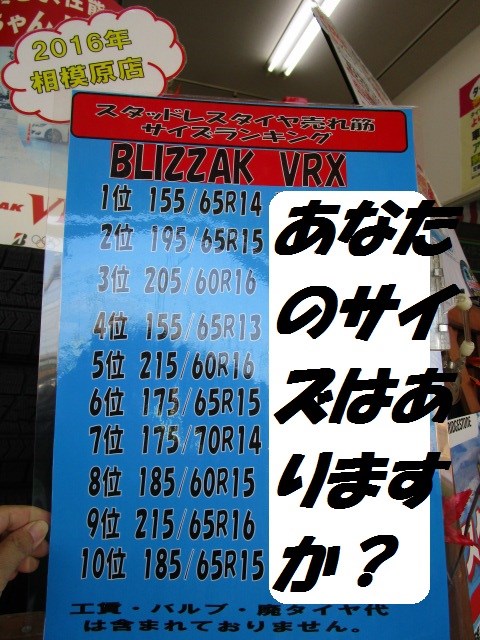 2016年相模原店、VRX売れ筋タイヤサイズランキング!!