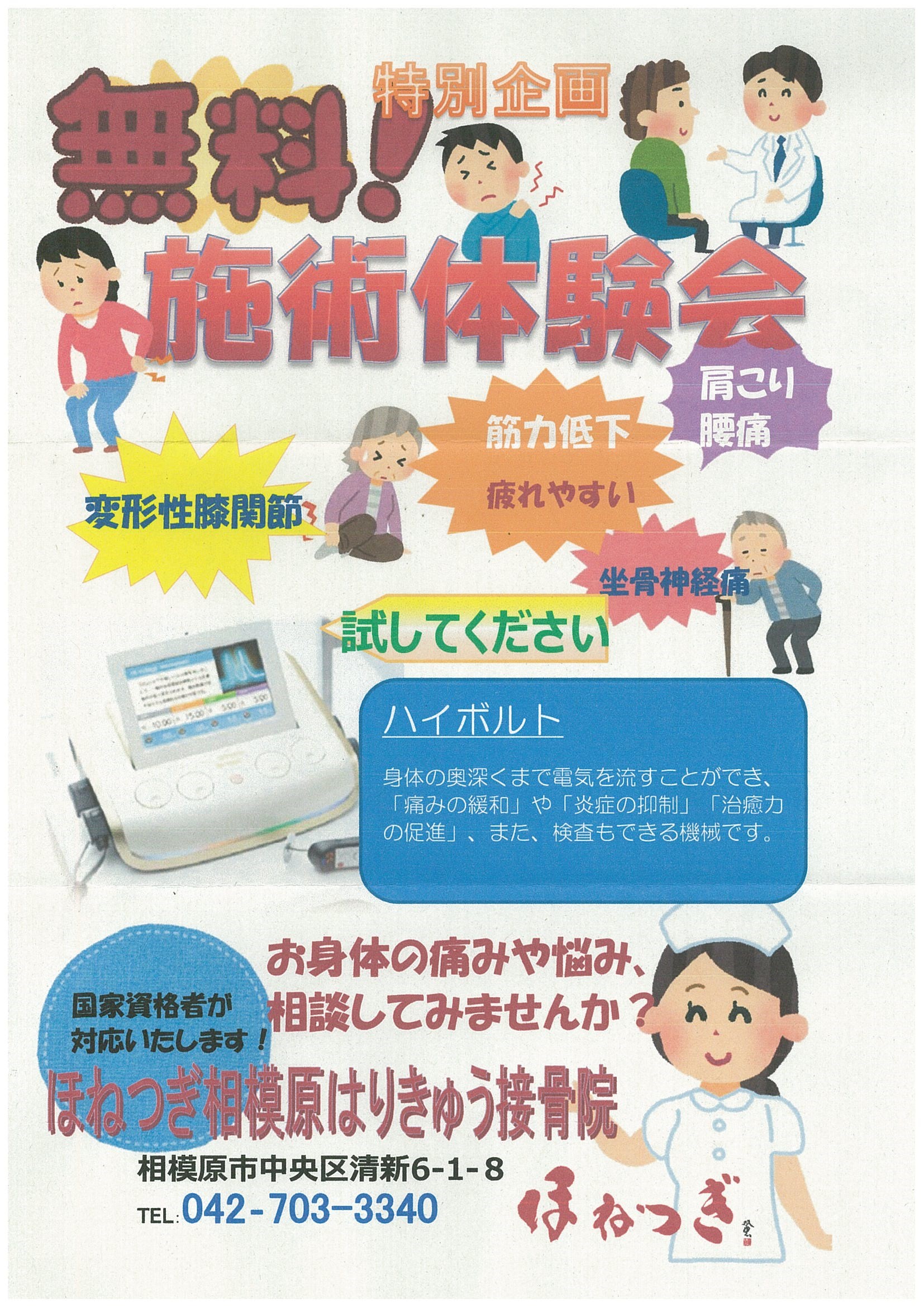 「ほねつぎ相模原はりきゅう接骨院」さんにお越し頂いて施術体験会を行います!!!