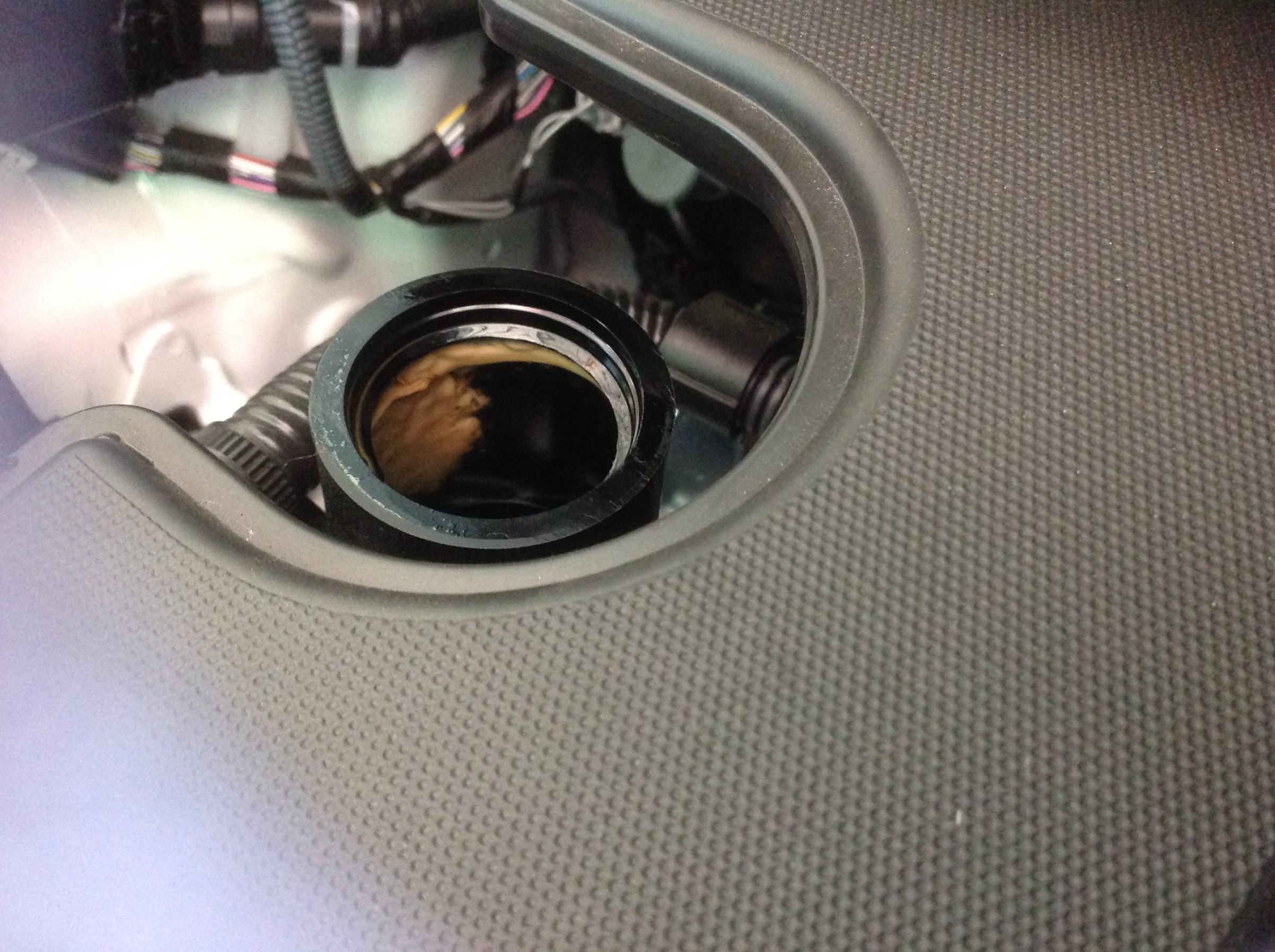 ピットにてボンネットを開け、オイルフィラーキャップをあけると、、、