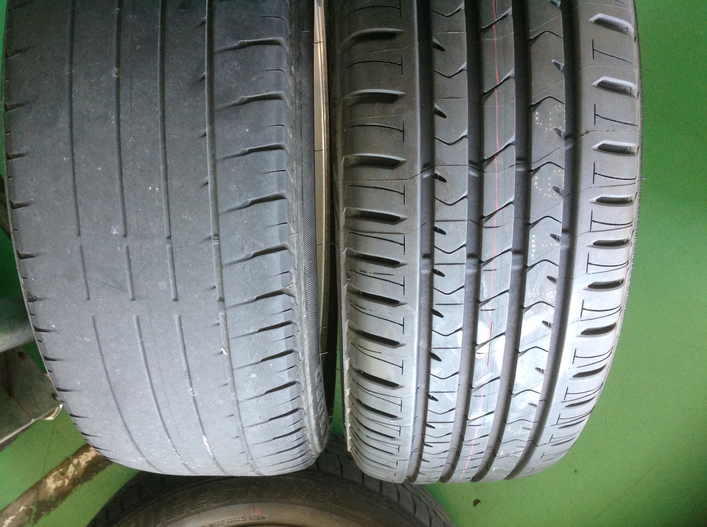 新品タイヤとの見比べです。どちらが新しいものか、一目瞭然ですね。