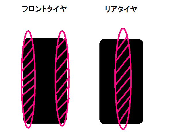 (イメージ図 〇で囲われた斜線部分が極度に磨耗。)