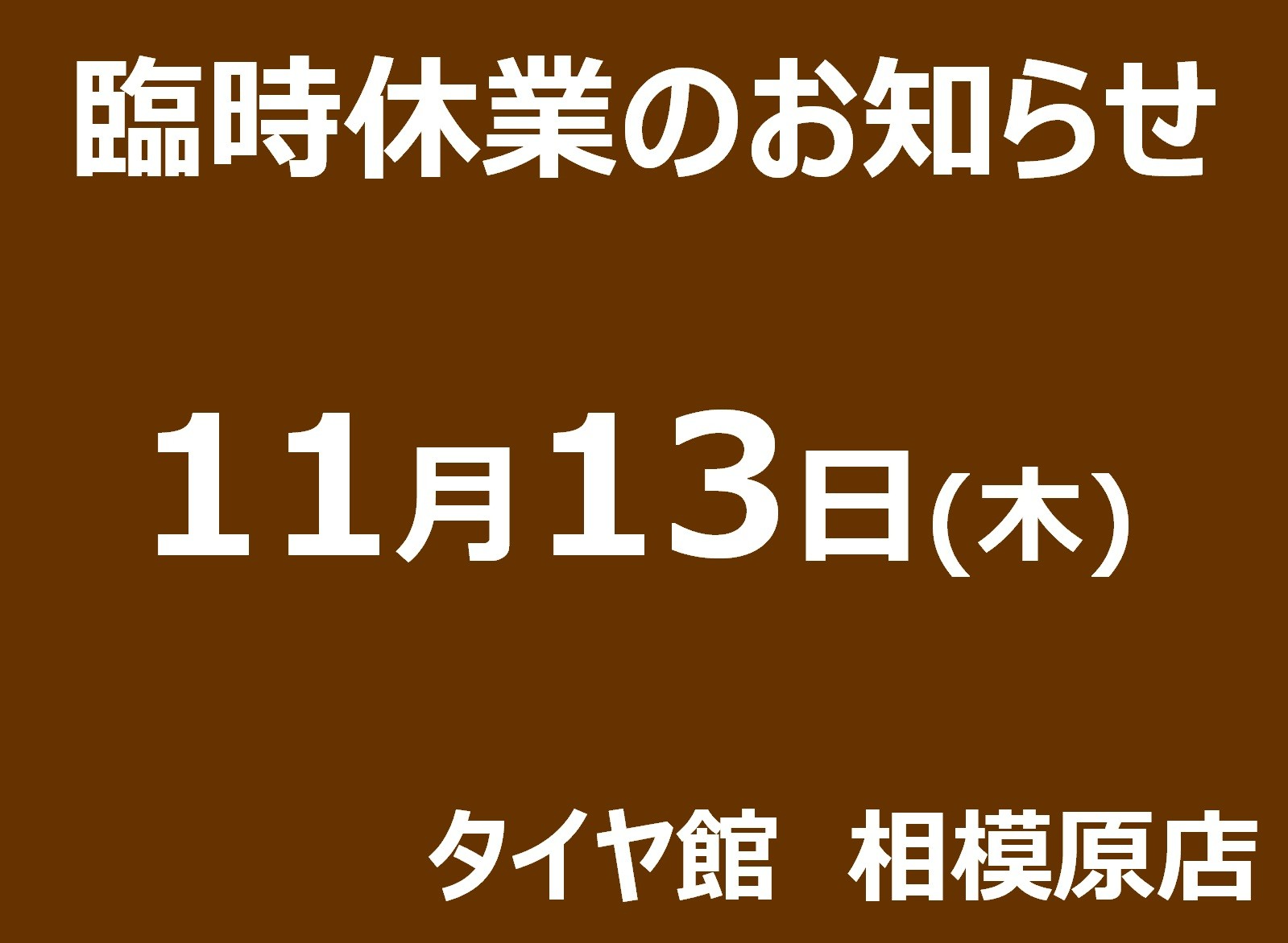 いつもタイヤ館 相模原店をご利用いただき、誠にありがとうございます。 急なご案内となり恐縮ですが、11月13日(木)は 臨時休業とさせていただくことになりました。お客様には大変ご迷惑を おかけいたしますことを深くお詫び申し上げます。 11月14日(金)より通常営業致しますので、何卒ご理解の...