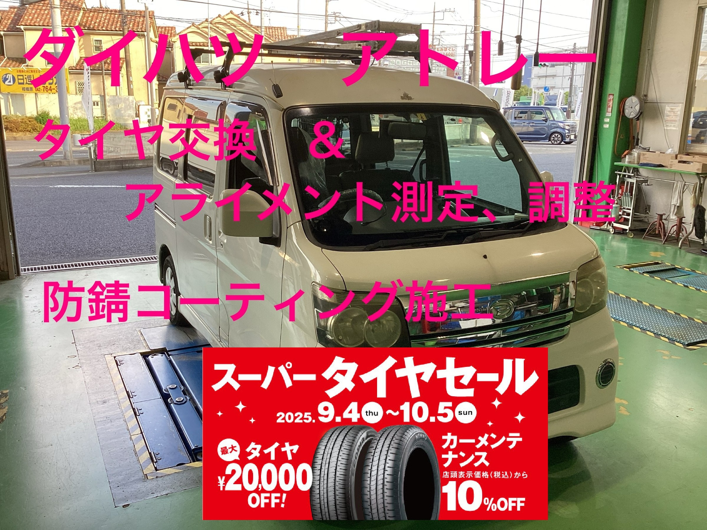 皆様こんにちは! タイヤ館相模原店の渡邊です 本日はダイハツ アトレーの タイヤ4本交換とクルマの骨盤矯正!アライメント測定、調整作業 防錆コーティング施工のご紹介です('◇')ゞ お客様より何度タイヤを変えても 前のタイヤの肩の部分が削れてしまい すぐに交換しなくてはいけなくなるとご相談...