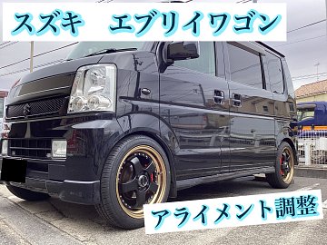 こんにちは!いつもタイヤ館相模原店HPご覧いただきありがとうございます(*'▽') スズキ、エブリイワゴンのアライメント調整をさせていただきました! 調整しやすい位置までリフトを上げて高さ調整をします。 ホイール4本に機械を取り付けセンサーの位置も合わせて準備完了です。 センサーをキャッチ...