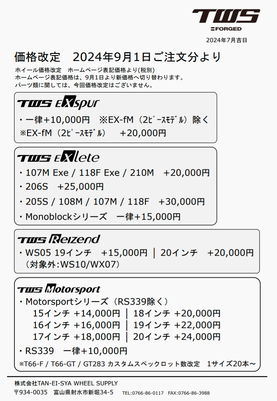 今日は 世界中のカスタマーに有名な ホイールメーカー 鍛栄舎 TWS さんの 価格改定のお知らせです。