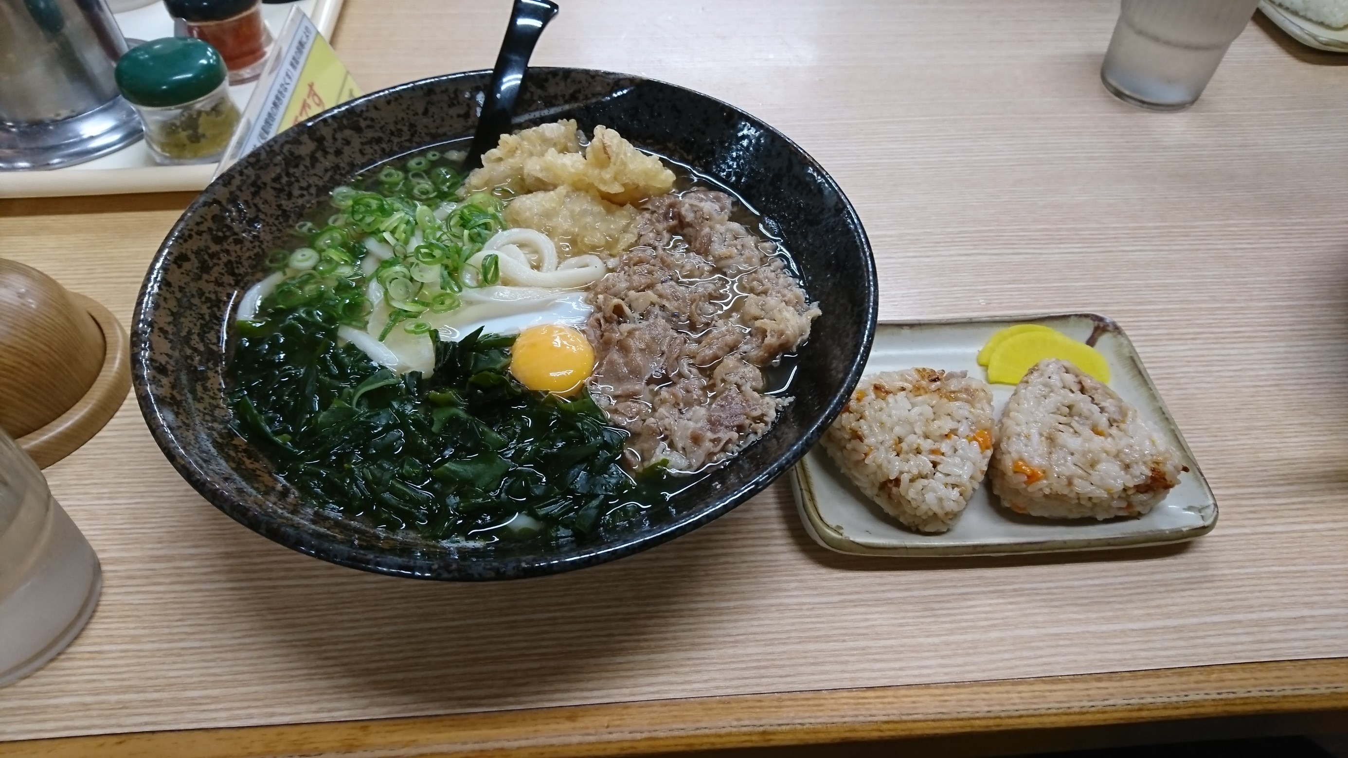 自分へのご褒美とは言わないですが、帰りに寄った人力うどんにて、スペシャルうどんにかしわのおにぎりをつけました(笑)