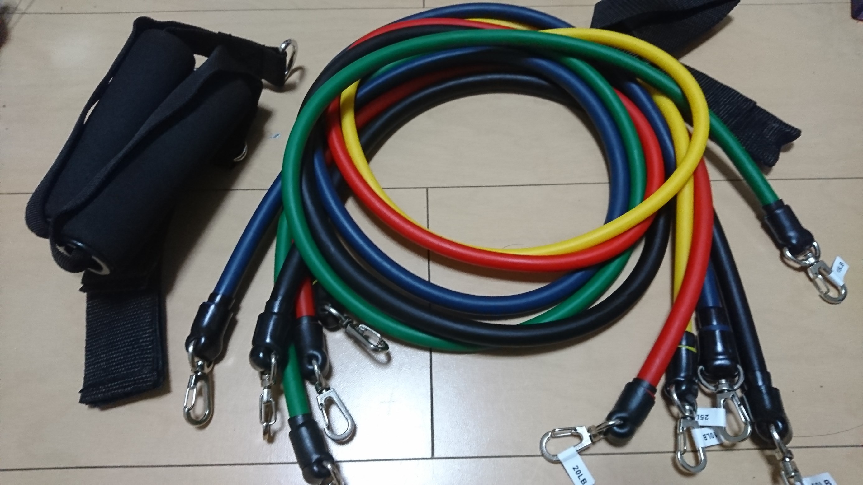 色んな硬さのチューブが入っていて、色んなやり方で伸ばして筋肉に負荷をかけるというもの!