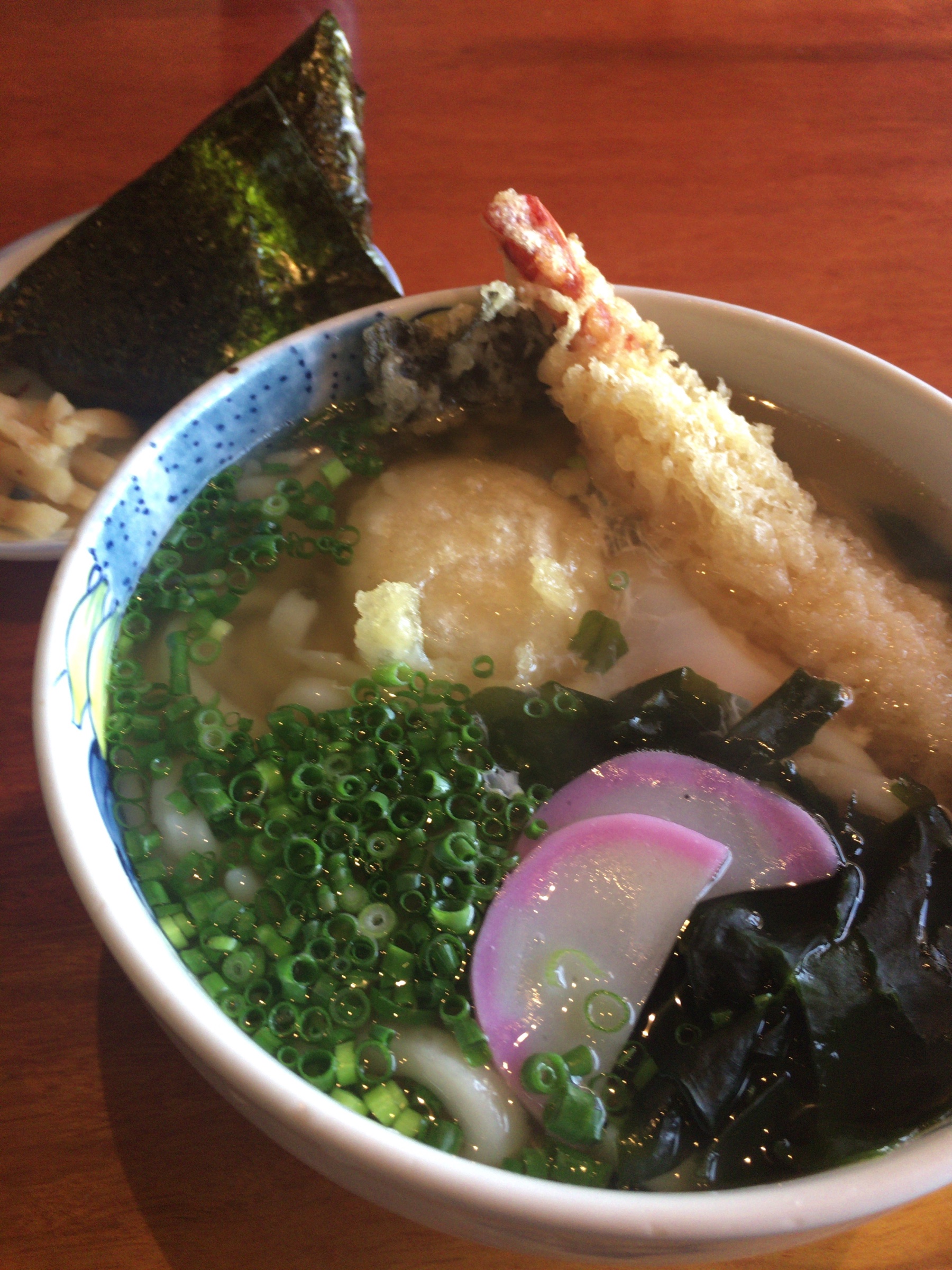 海老天やら餅やら入った山忠うどんとおむすびを頂きました〜!!