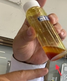 ビンが「黄色」変色しました、底にスラッジが貯まってます、この「汚れたビン」がエンジン内側の再現です