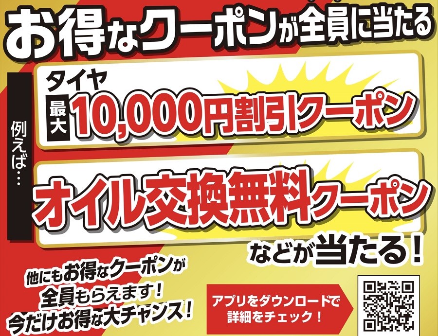 今回のイベントでは、「タイヤ館アプリ」をご利用いただければさらにお得です