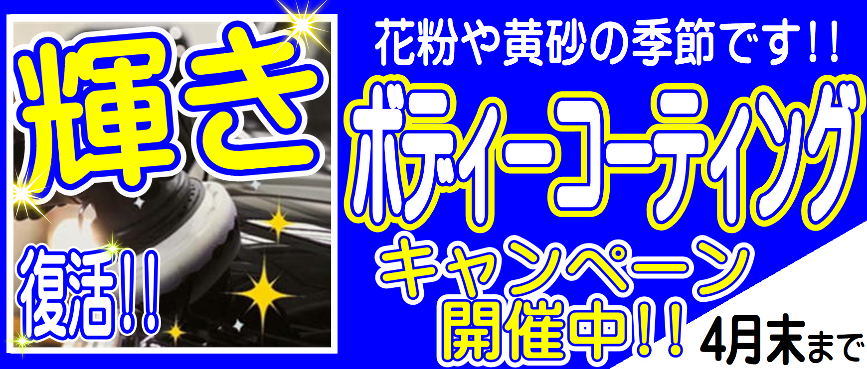 ボディーコーティングキャンペーン!! ポスト 2022年4月9日 こんにちは村岡です。 これから行楽シーズンですね、お出掛けの機会も多くなると思います。 ただ花粉・黄砂の季節でもありますので、お車の汚れが気になる季節でもあります。 そんな中、第二弾キャンペーンとして限定台数にてお得な価格をご用意しました。 施工予約も承っておりますのでお気軽にお問合せ下さい。