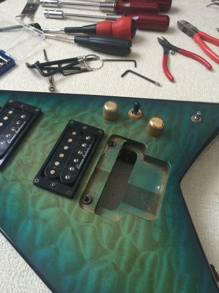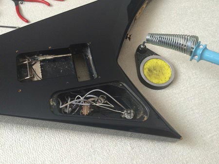 続いてピックアップ(音を拾うマイクの部分)を外すのですが、配線類を取らないと取れません。