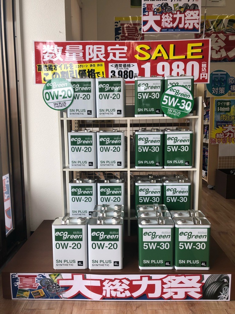 で、タイヤ館のセールには欠かせないお買い得オイル「エコグリーン」今回も入荷しております。