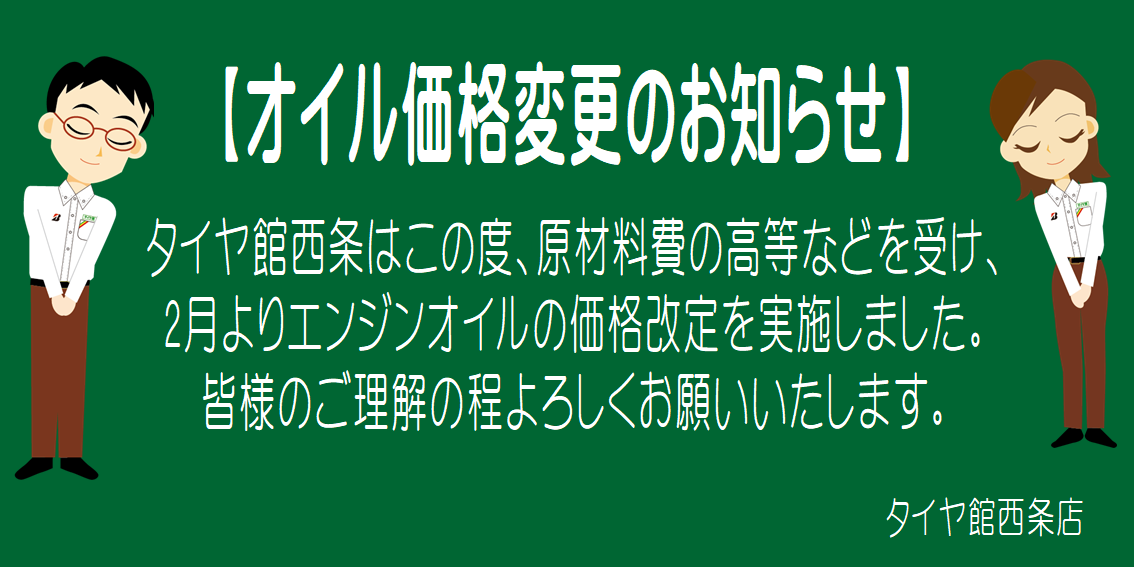 エンジンオイルの価格変更について ポスト 2023年2月2日 平素よりタイヤ館西条をご愛顧いただき誠にありがとうございます。 この度、当店では原料価格高騰などに伴い 2023年2月よりエンジンオイルの価格を値上げさせていただく運びとなりました。 詳細の価格に関しましては、店頭まで問い合わせて頂きますようお願いいたします。 大変心苦しいお知らせではございますが、 何卒ご理解ご了承の程よろしくお願い申し上げます。 カテゴリ:お知らせ