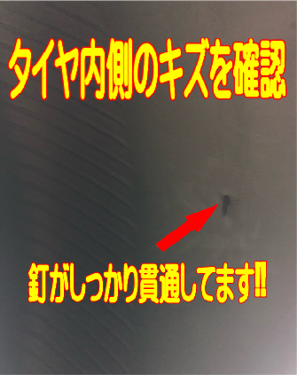 釘の刺さった跡と一緒にタイヤに傷が無いか、内側からしっかり点検します。