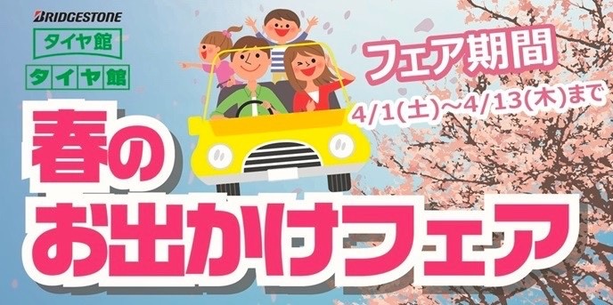 春のお出かけフェア開催!! ポスト 2023年4月1日 春のお出かけ前に、タイヤ点検(空気圧や残溝)はもちろん、 メンテナンス点検いかがですか?? 当店では、いつでも無料で行っていますのでお気軽にお越しください♪ ★フェア開催期間★ 4/1(土)〜4/13(木)まで タイヤ館 西条住所:739-0044 東広島市西条町下見4142-1 TEL:082-421-5677 WEBから作業予約も出来ます