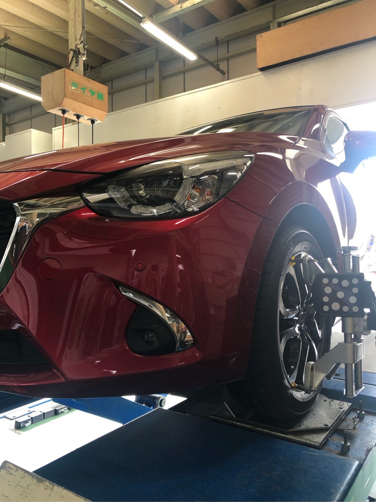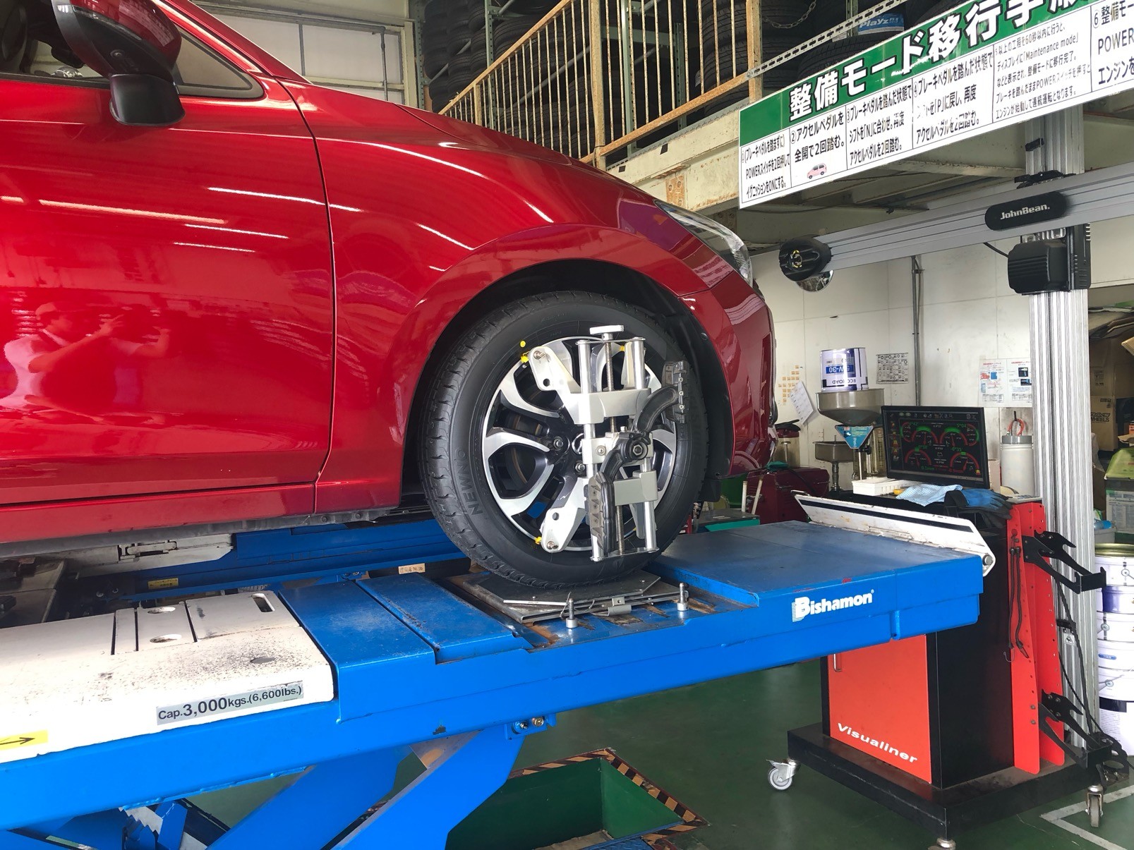 こちらのお車全体的にタイヤが外側摩耗しておりましたので、しっかり調整させて頂きました。