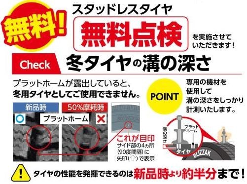 タイヤ館西条店では冬タイヤ/スタッドレスタイヤの無料点検実施中です。