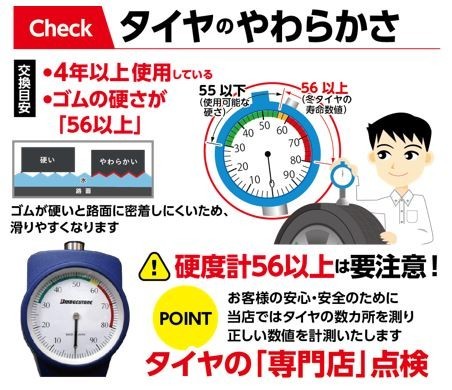 そう思ったら、持って来てください。残溝、硬度等をタイヤのプロが無料で点検致します。