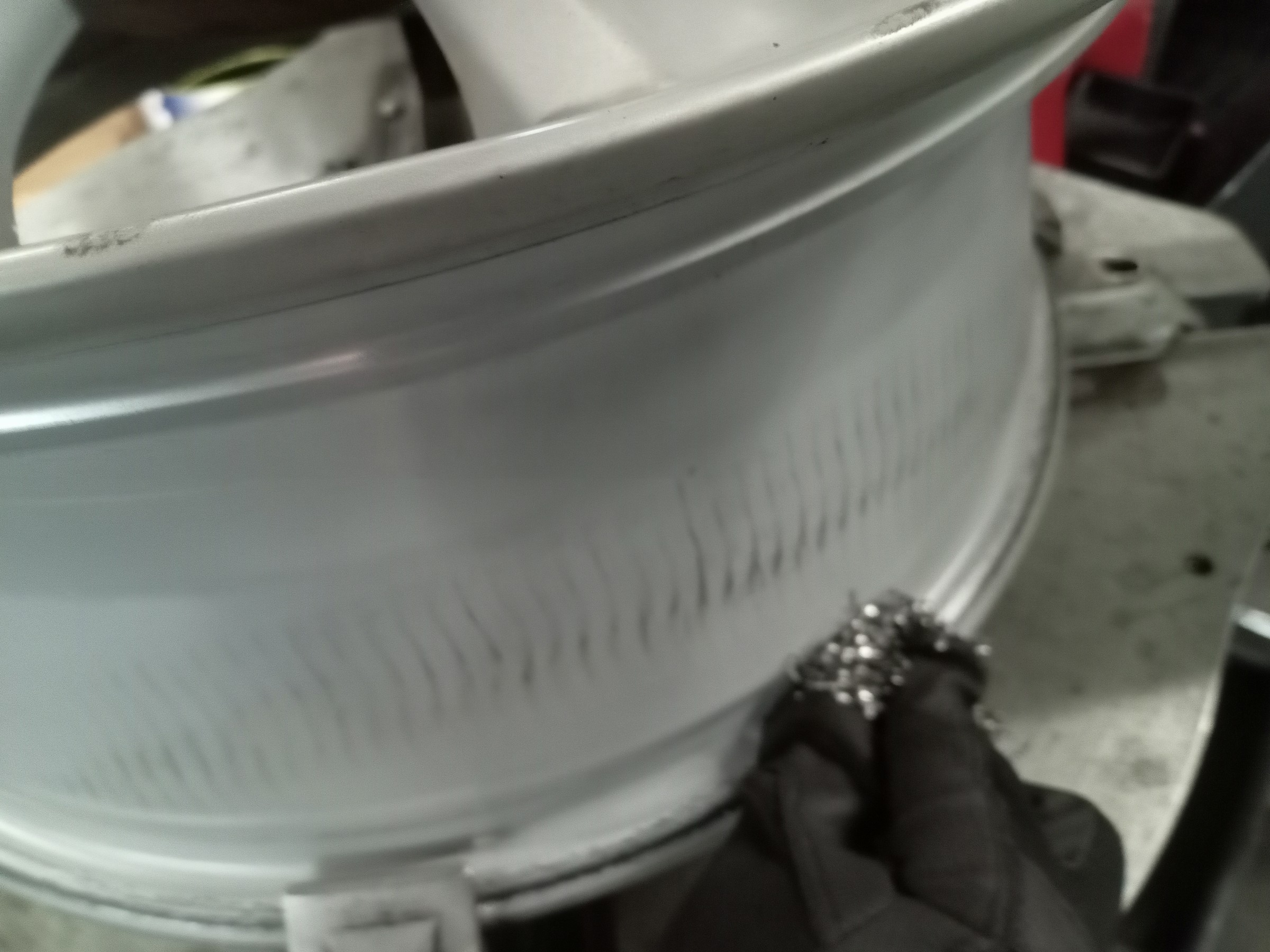 交換作業に入りますが、タイヤ・ホイールをバラしたあと、交換後のエア漏れ防止のため、ホイールのリム部分に付着したゴムのカスを除去します!