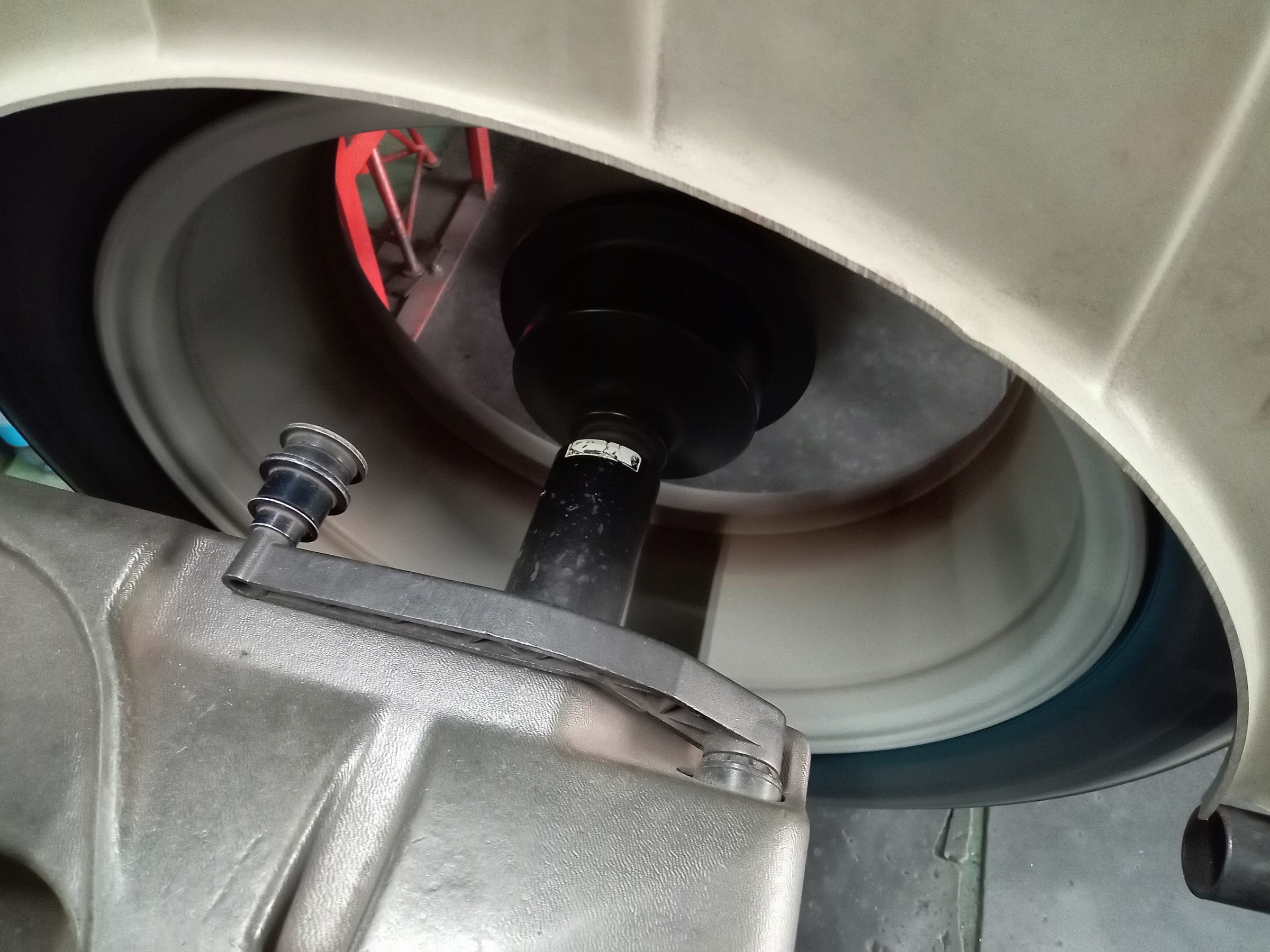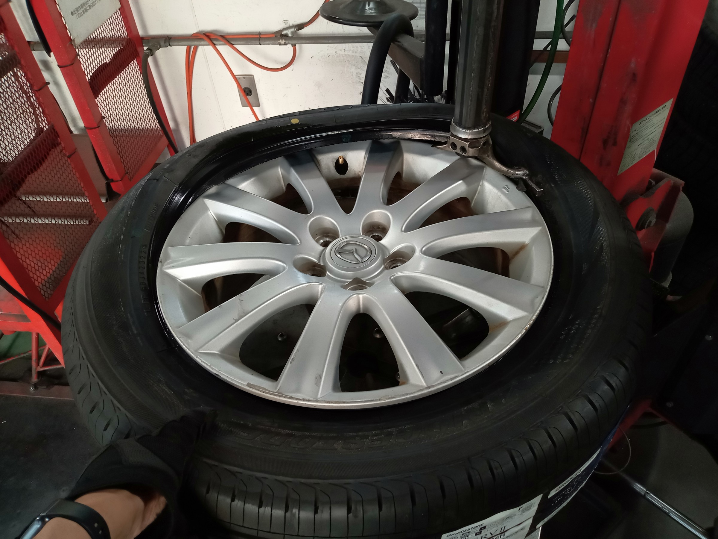 新しいタイヤを組み付け、空気充填を実施し、