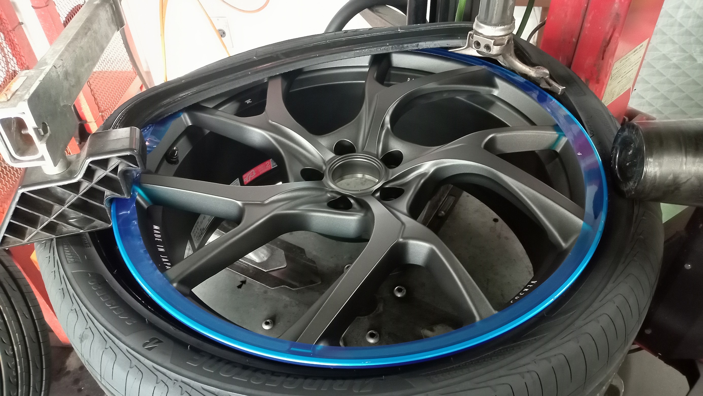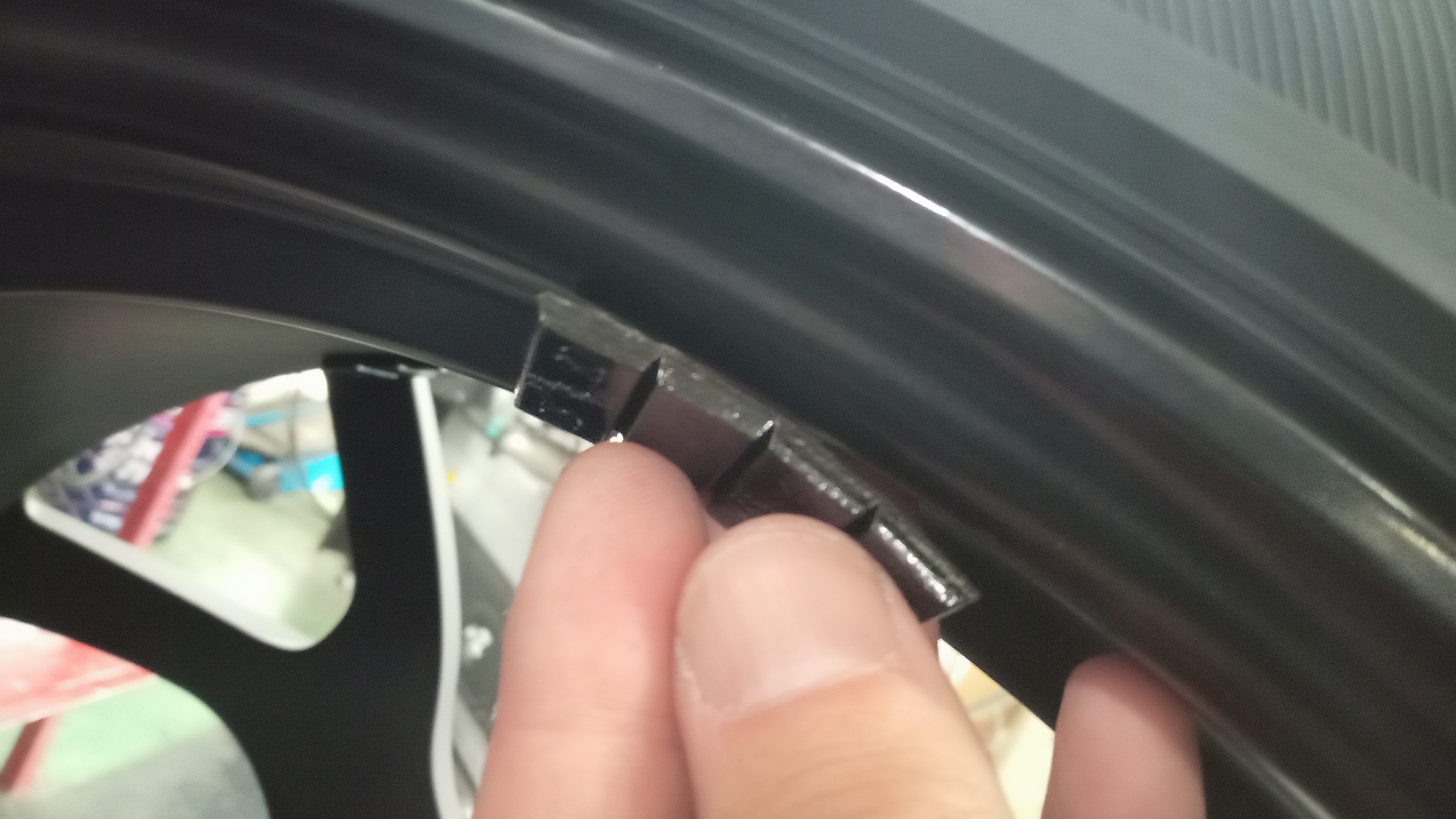 黒系のアルミホイールの場合、見た目でわかりにくくなる、黒のバランスウエイトでバランス調整実施しております!