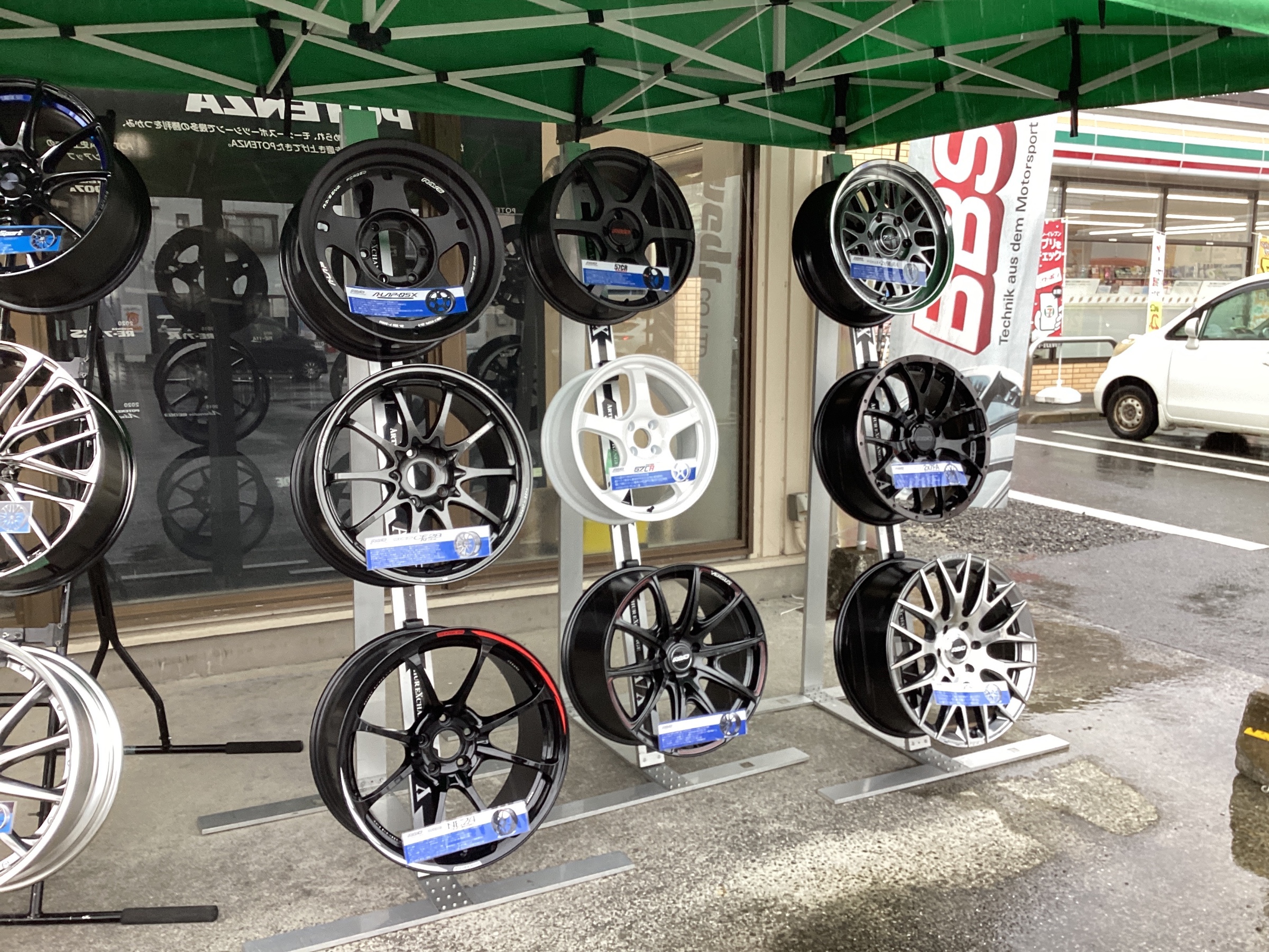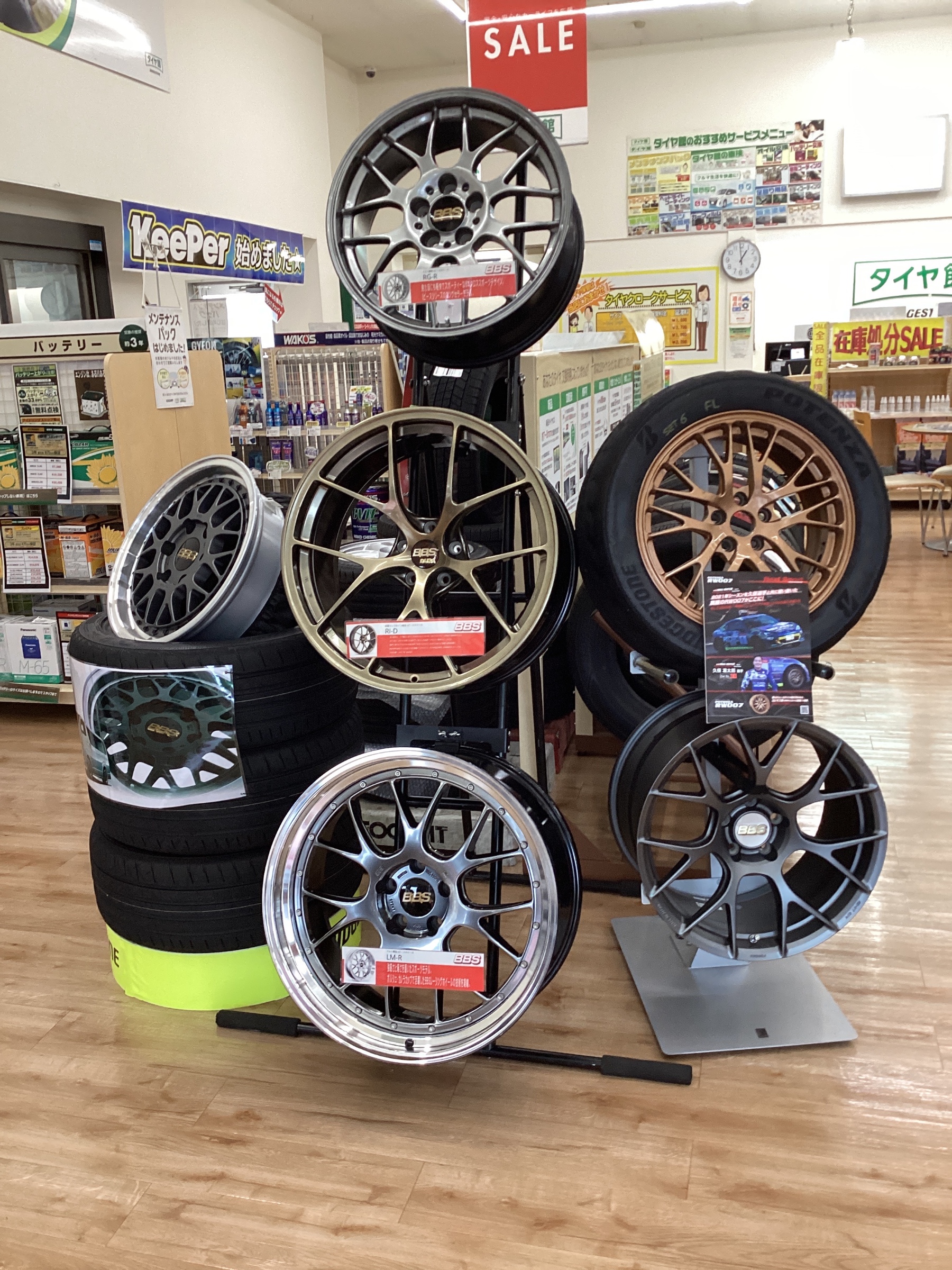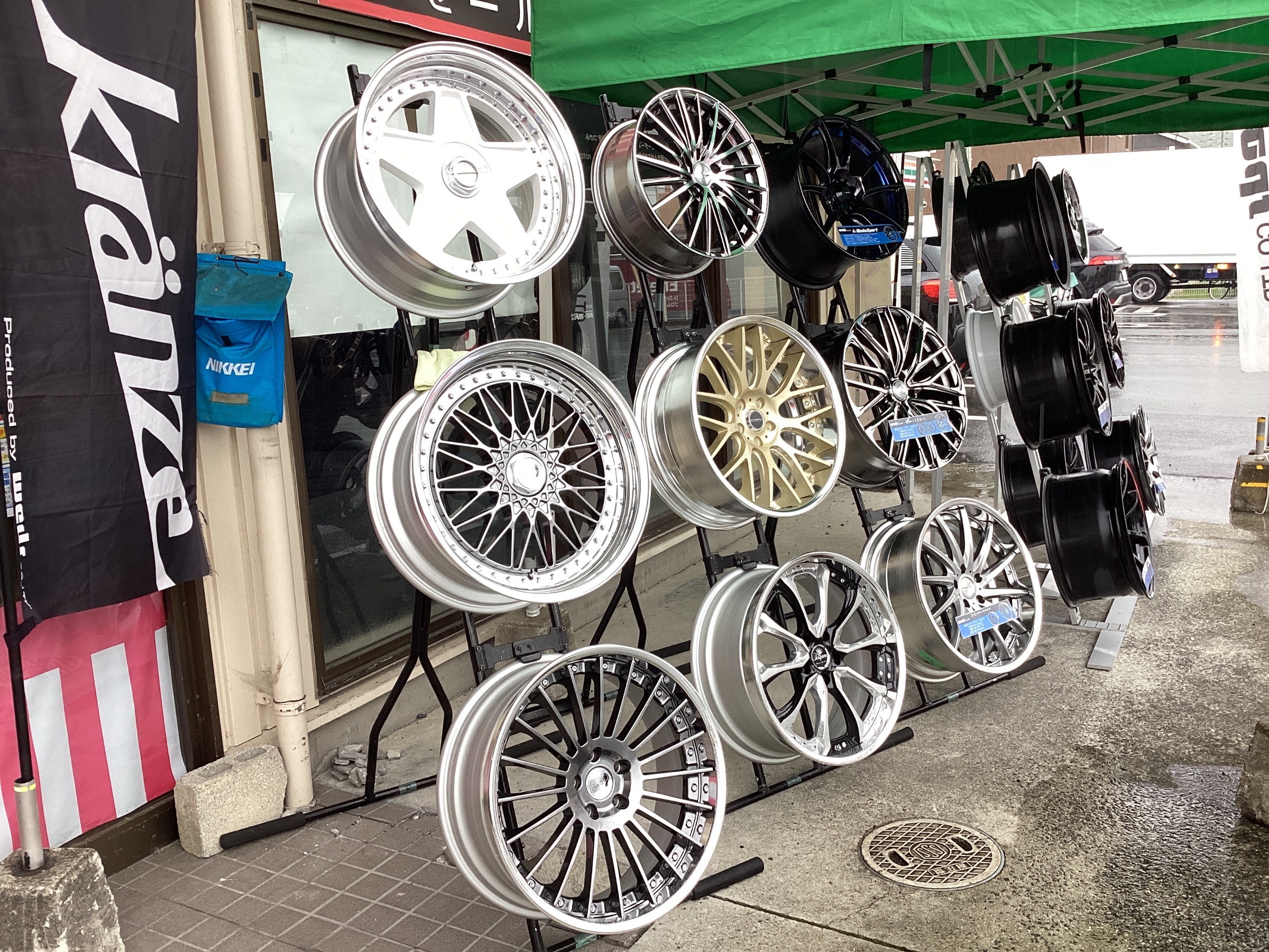店頭にてたくさんのホイール展示しています。