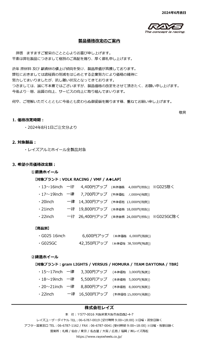 8月ご成約分より、RAYS製品アルミホイールの価格が改定されます。