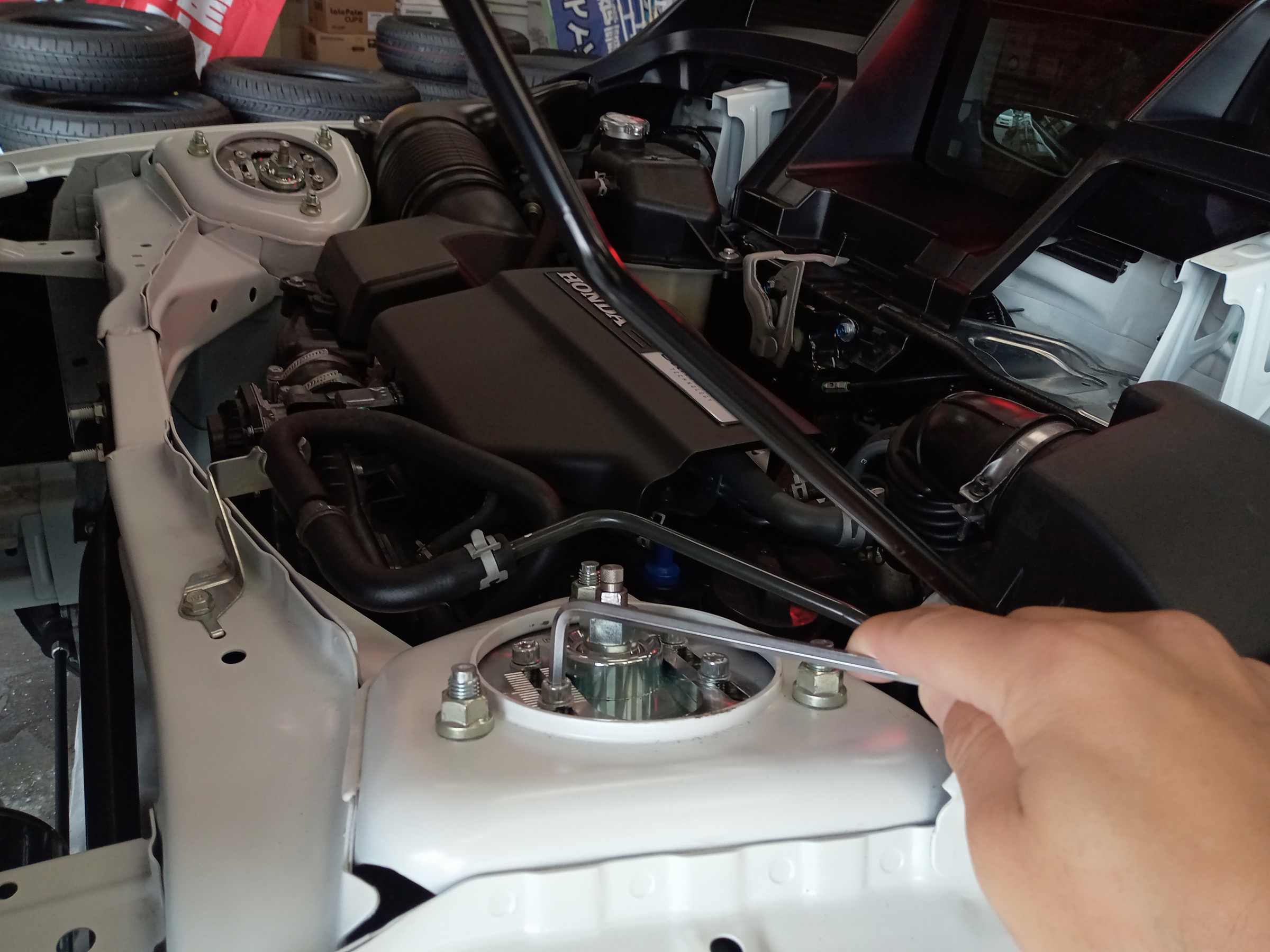 調整後にピロアッパーマウント締め付けです。