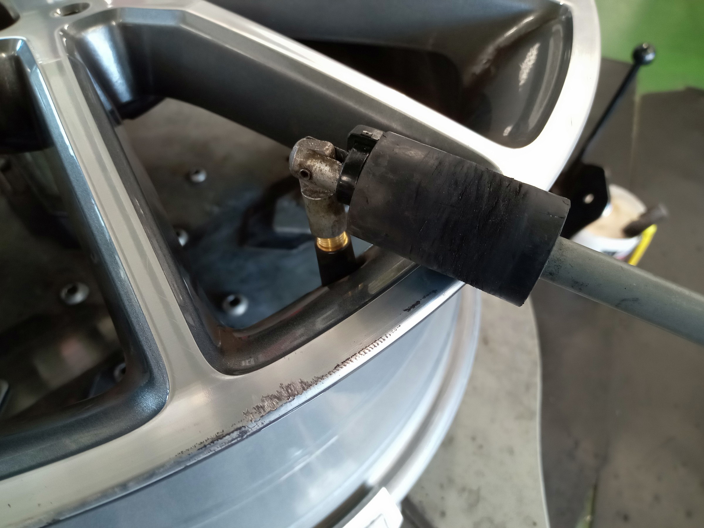 これまで使用されていたタイヤをリム解きし、バルブの交換を行いますが、ホイールのバルブホール部分が深く掘られているため、ノーマルの高さのバルブだと、空気圧調整時のバルブの開け締めが難しくなります。