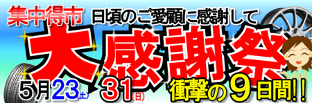 今週末から感謝祭です!! ポスト 2015年5月20日 こんにちは村岡です。今回は仕事のお知らせです。今度の土曜日から月末まで「集中得市~大感謝祭~」を開催します。GWのお出かけで疲れた車をリフレッシュ!!「オイル・バッテリー・オートマオイル」のメンテナンス商品はもちろん「タイヤ・アルミホイール」などのお買い得商品もご準備しています。是非週末はタイヤ館西条店にご来店お待ちしております。