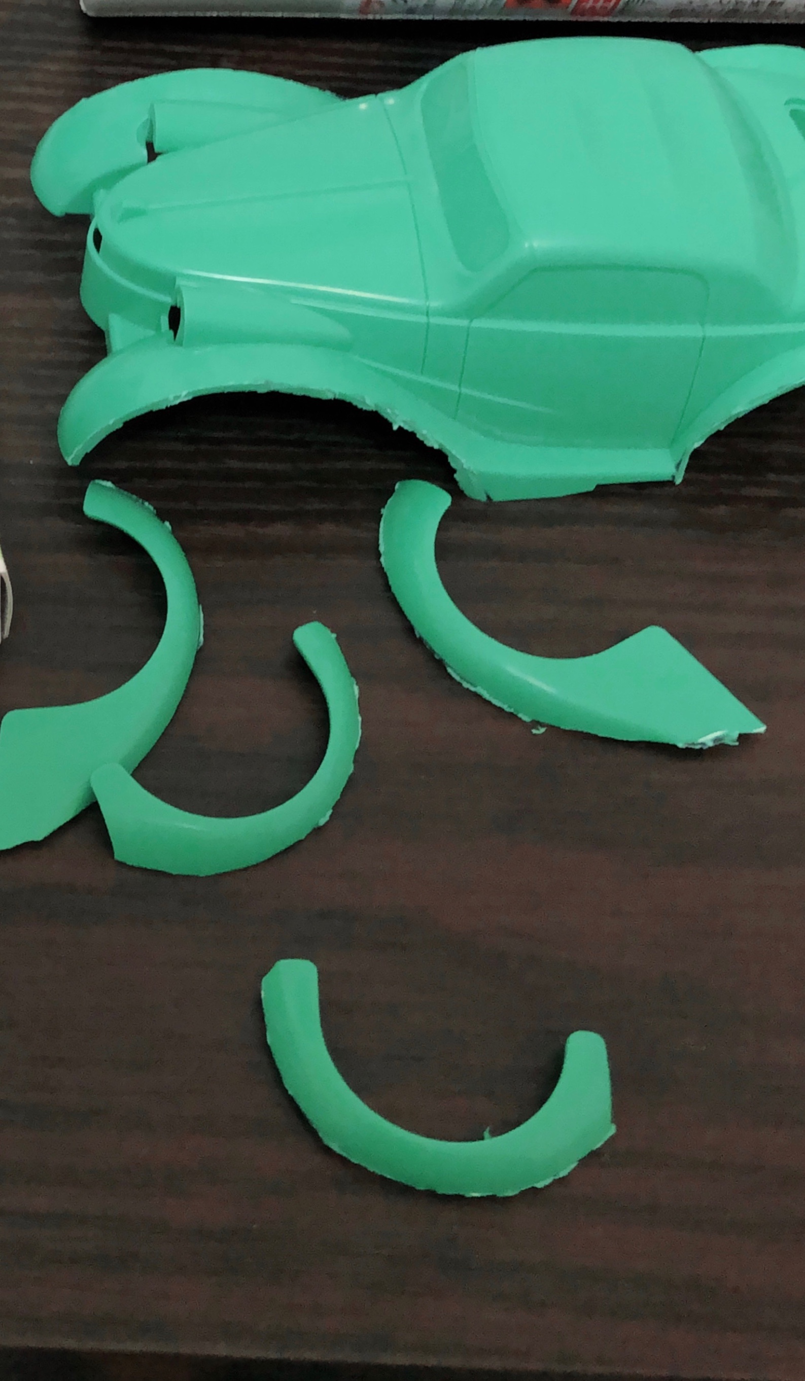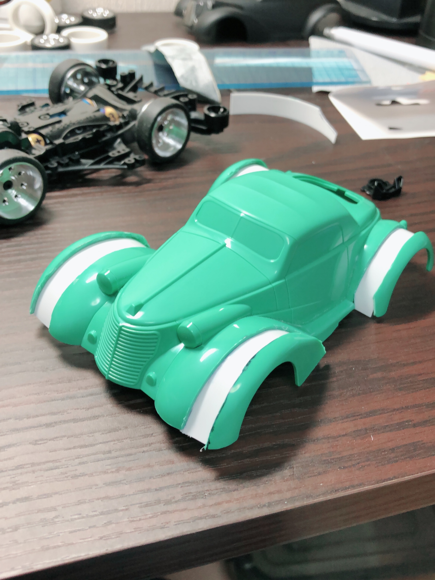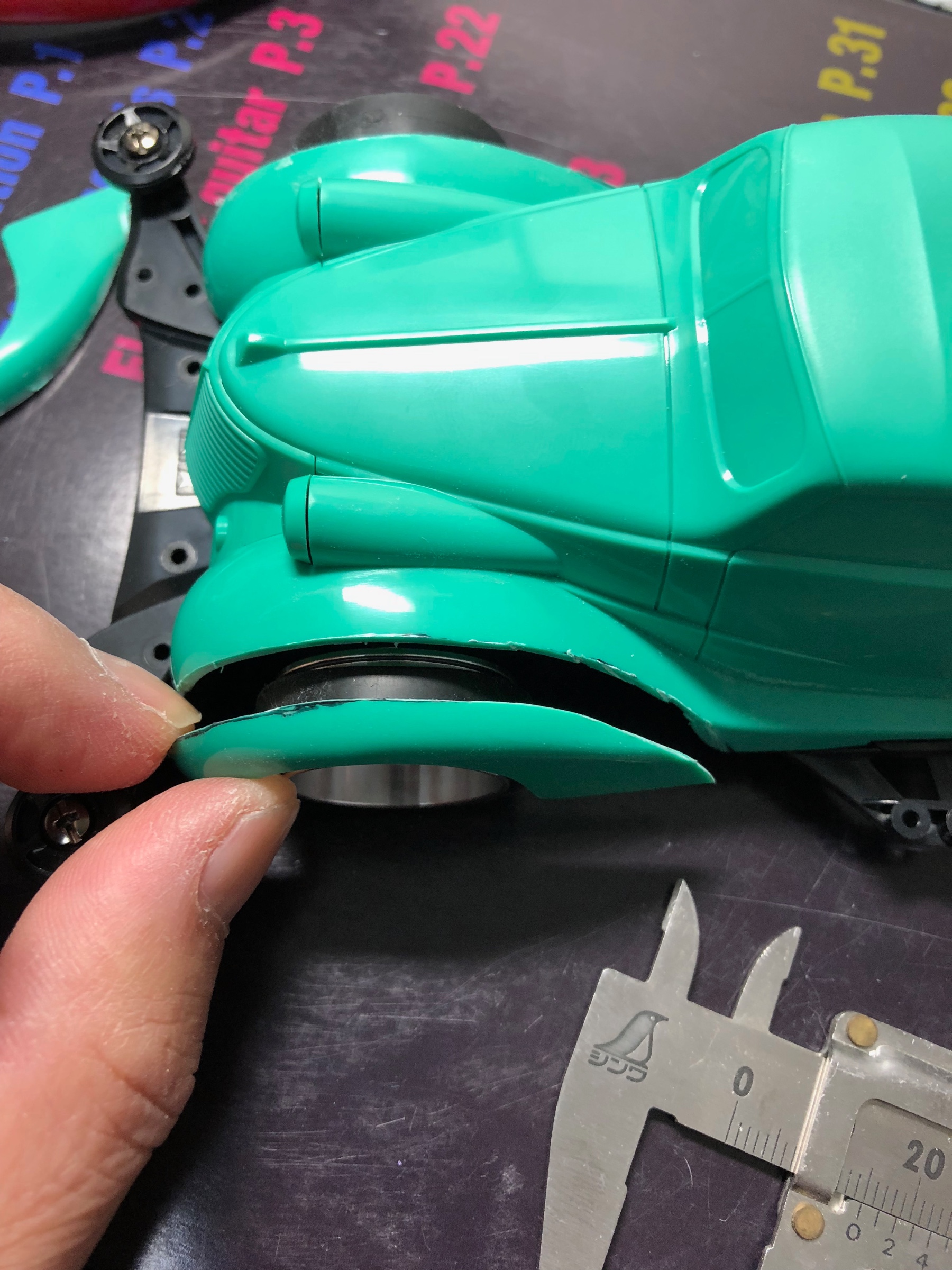 プラ板を切ってボディの内側に貼り付け、その後元のフェンダーを合体!!