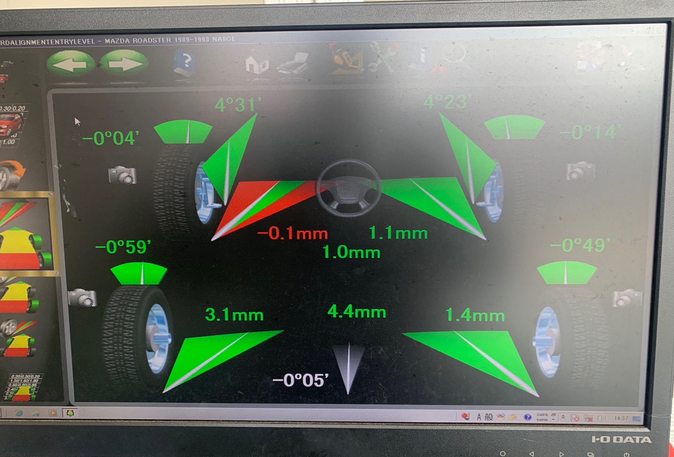 測定の結果は、若干の角度のズレがありました。基準値の範囲内でしたが、ただ、前輪のトーの角度が基準値よりも少なく操縦性に影響があるかも知れません。