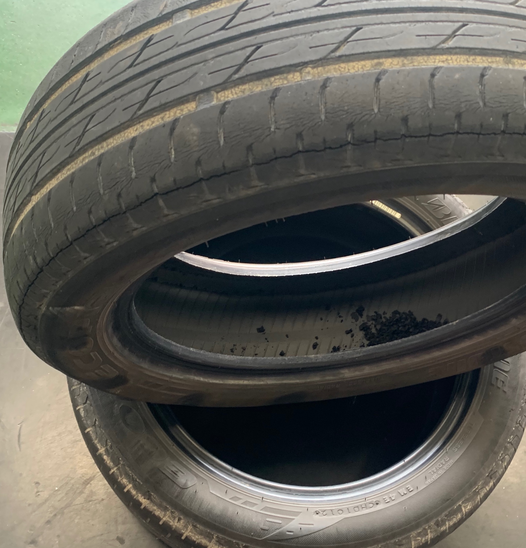 取り外したタイヤは、劣化とパンクのキズで危険な状態、