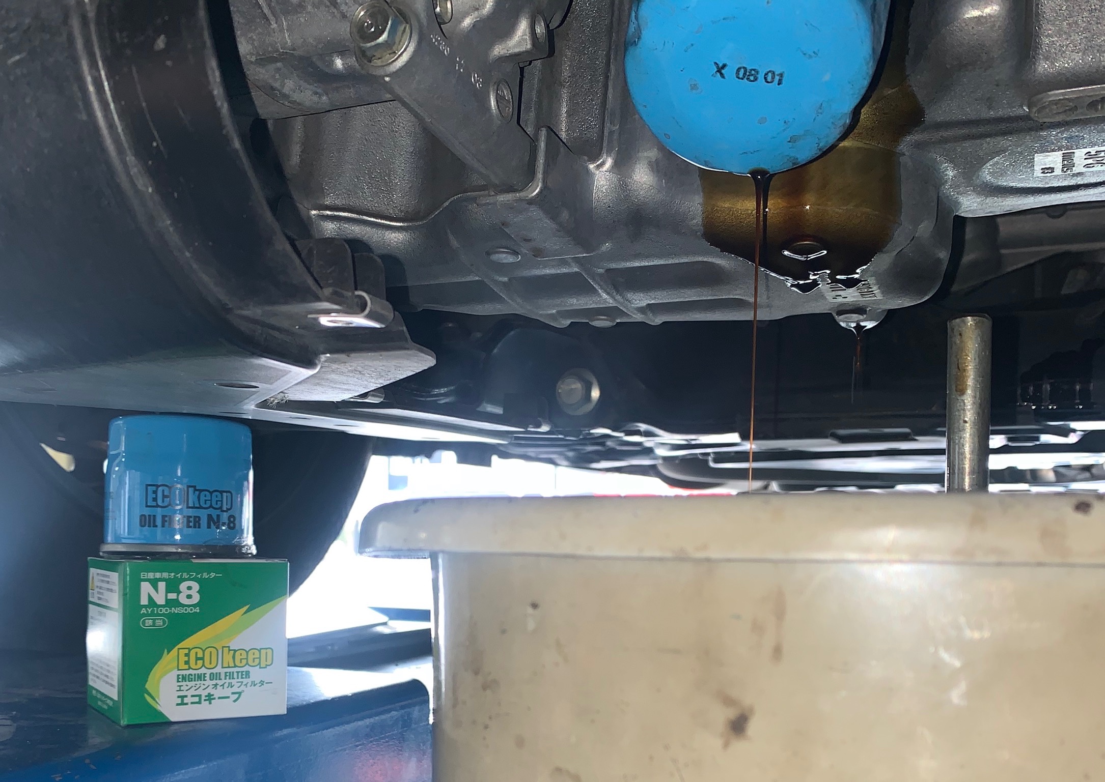 オイル交換後、ドレンボルト、エレメントフィルターから漏れていないかチェックをします、アンダーパネルを戻して完了です、