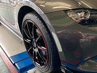 純正車高、純正タイヤサイズでの装着(17インチ) RAYSの限定モデル(RAYS グラムライツ57Transcend REV LIMIT EDITION) センターキャップ有で取り付け アクセントの赤がお車の内装のステッチとおそろいです! フロントのサイズがけっこうギリギリです、純正車高では、おそらくこのサイズが限界です。