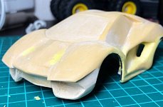こんにちは村岡です。 この企画はじめて一ヶ月かかってここまできました! そう「デフォルメミニ四駆企画」です。 前のバンパーを作って、大体の形が出来ましたので粗を見る為にサフェーサー吹いてみました! パテ盛りまくってからここまで長かった・・・・ 天気はイマイチですが吹いてみました サフ拭...