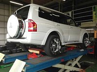 今日のアライメントはパジェロです。 以前のパジェロと違い、リヤの足回りが大幅に変更になり、オンロード寄りになったのかな?って思った覚えがあります。 で、複雑になった分アライメントも大変な訳で… 最近調整箇所の多いアライメントに遭遇する確率の高い澤井でした。