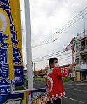 いよいよ本日から愛車点検フェアが始まりました!! 3/4日・10/11日の週末には先着20名様に花火もプレゼントしています! そんなイベントを盛り上げるべく、澤井チーフが店舗前で元気に旗を振ってくれてます。 チーフと言えばマスク!!って感じになってきましたが・・・・PM2.5対策?? 「暑くない??」