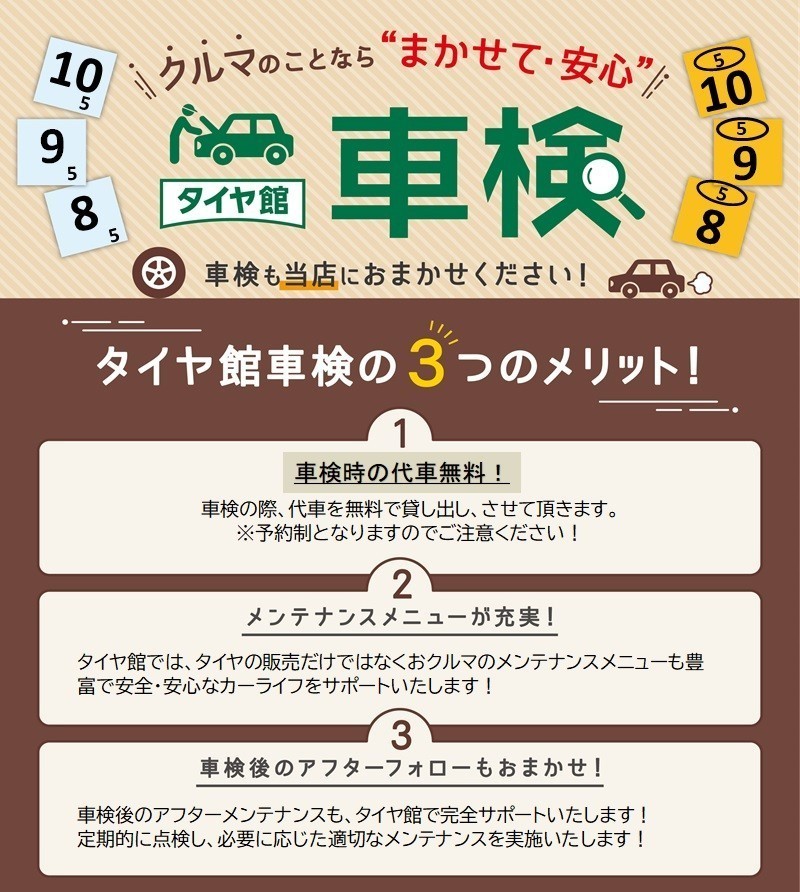 車検予約受付中 車検のご予約はお済ですか?タイヤ館の安心車検で納得整備 整備中の代車も無料で貸し出ししています。