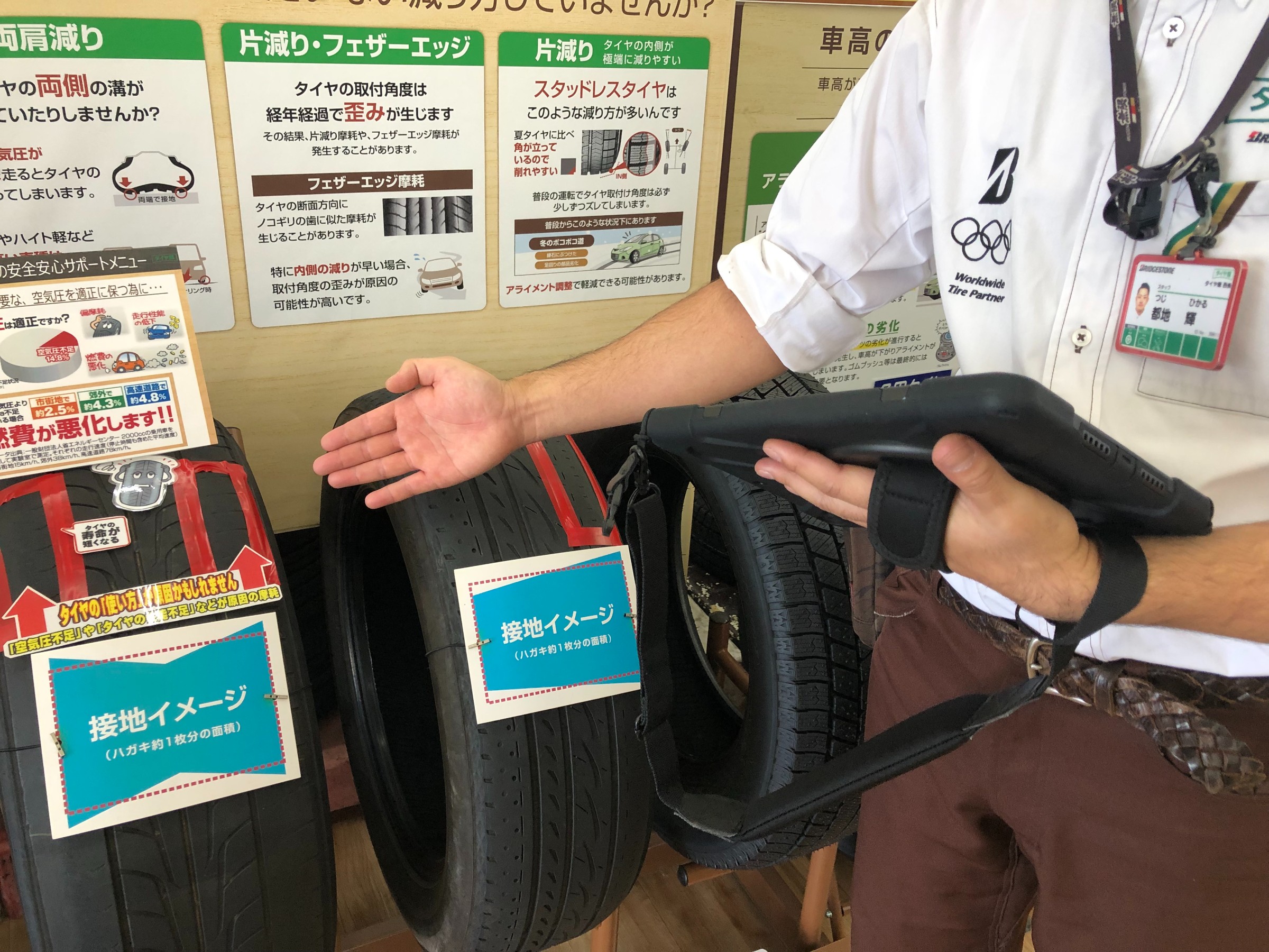 タイヤ館西条ではタイヤ専門店として よりわかりやすくタイヤをお選びいただけるよう、 タブレットを使った商談を行っております。 タイヤの選び方説明はもちろんですが ↑このように、 今お客様がお使いのタイヤの状態を 4本全て点検をさせていただき、 お客様の使用状況にあったタイヤを プロがわ...