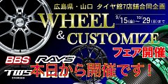 いつもご覧いただきありがとうございます。 広島県東広島市にあります、タイヤ館西条店です。 アルミホイールフェスタ & カスタマイズフェア 開催!! 一番の見どころタイミング 「アルミホイールの展示会」 本日(10/6)から(10/9)までの4日間開催です! 当日は大人気ホイール(BBS・RAYS・WORK・WE...