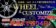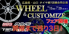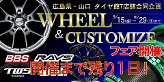いつもご覧いただきありがとうございます。 広島県東広島市にあります、タイヤ館西条店です。 現在開催中のホイール&カスタマイズフェア 一番の見どころタイミング 「ホイールの展示会」まで 残り 4日 となりました! 当日は大人気ホイール(BBS・RAYS などなど) 普段なかなか現物を見るこ...