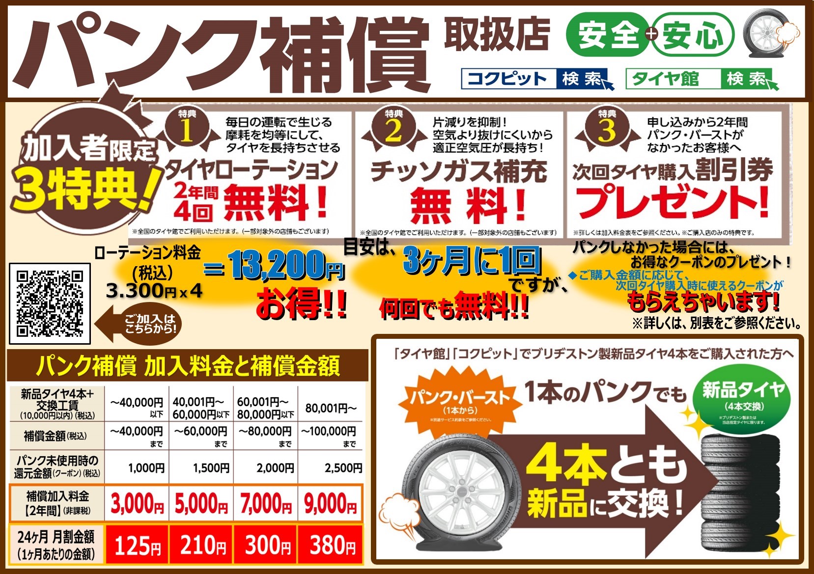 いまタイヤ館かわごえでは、タイヤをご購入頂いた方に「パンク補償」をご案内しております。