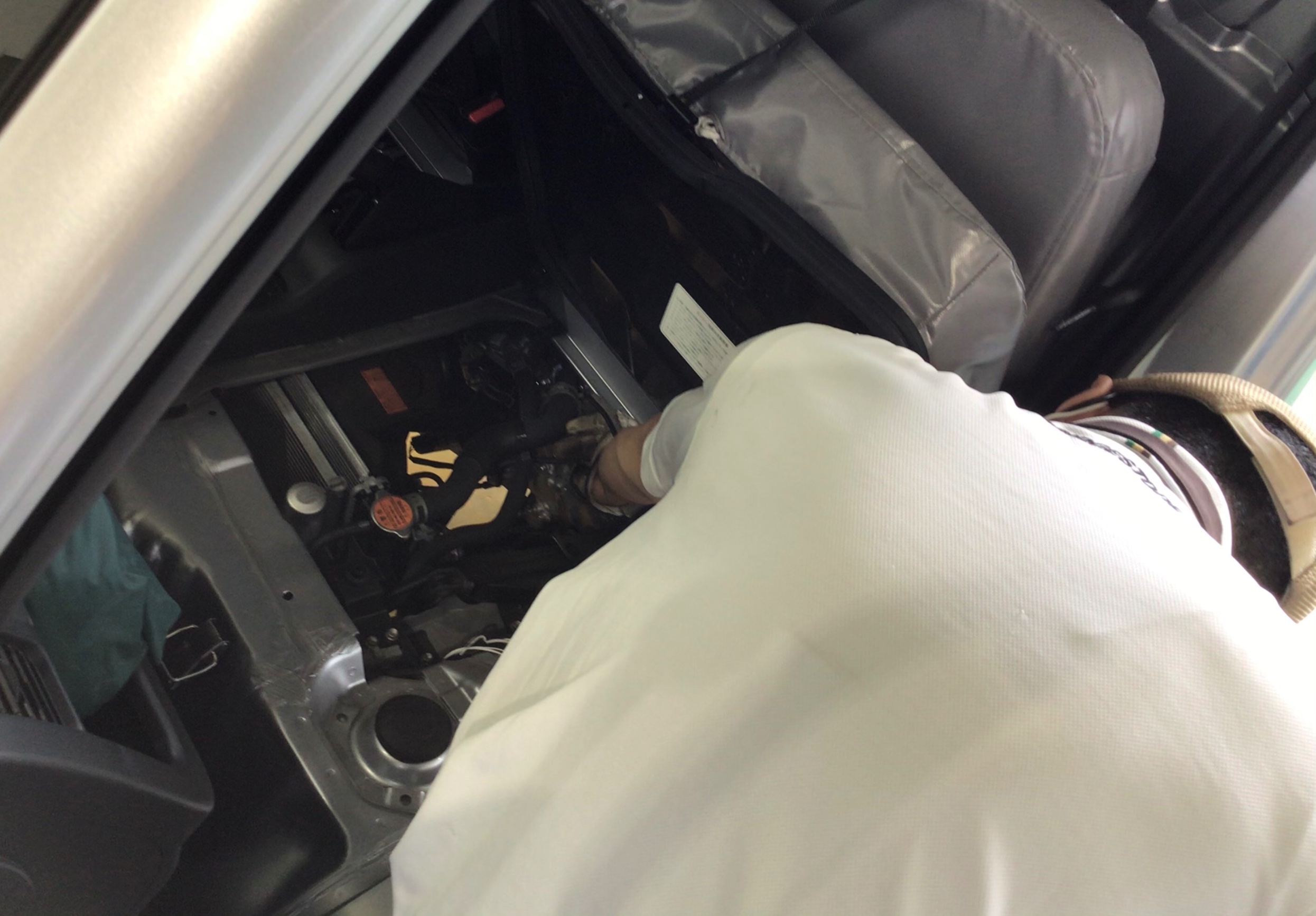 シートを上げてエンジンルームに覗き込む様に作業しております。