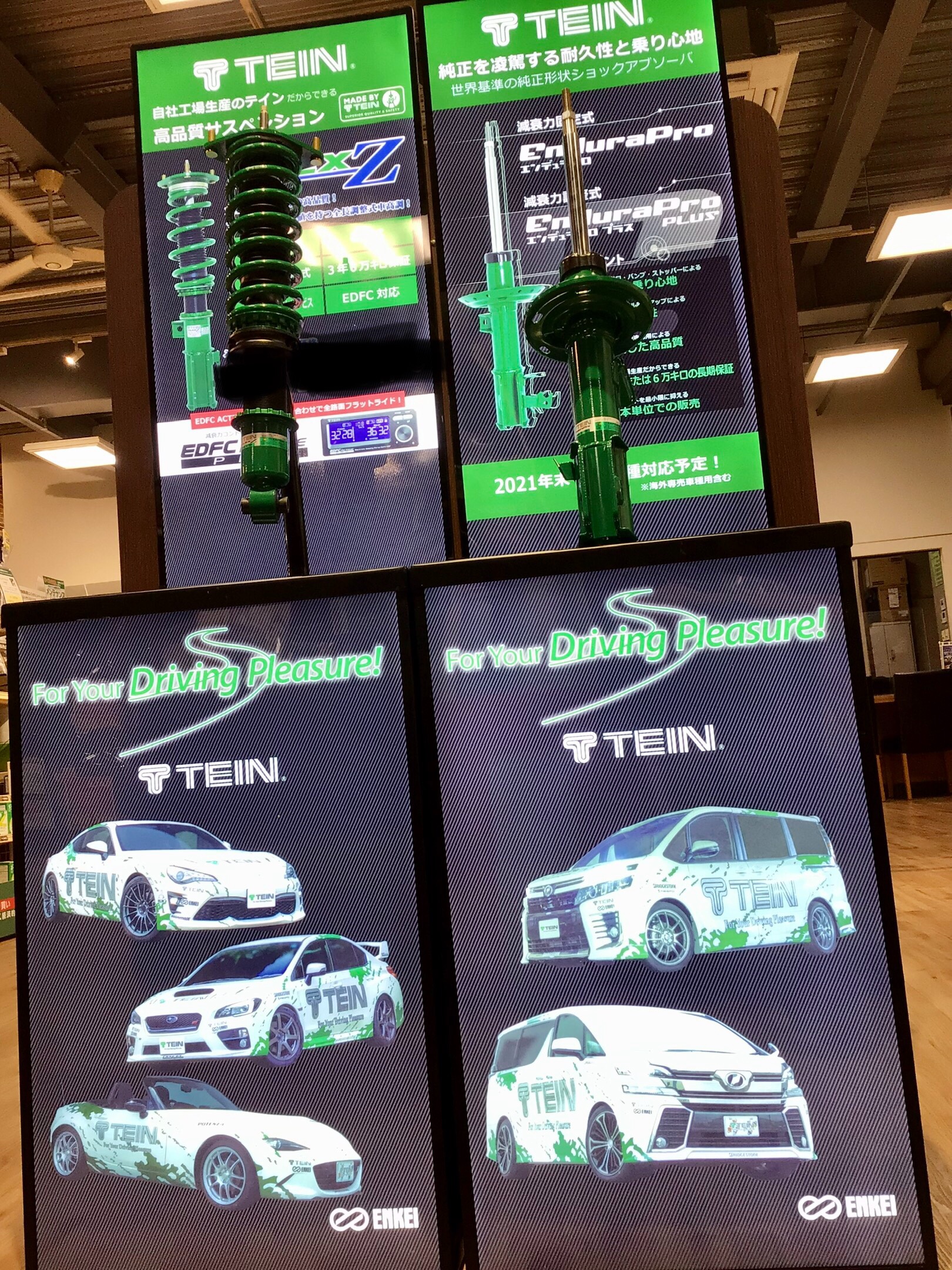 TEIN足廻りコーナー ポスト 2021年8月23日 こんにちは〜 タイヤ館かわごえでは新しく TEINの足廻りコーナーを作成しました! ショックとサスペンションを展示してます! 見やすさやライトアップで綺麗な見た目になっています! 是非興味ある方も無い方も見に来てください♫ お待ちしています!