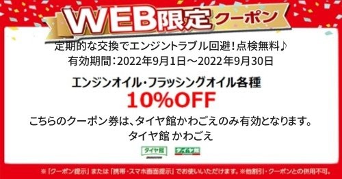 こちらのクーポン券は、タイヤ館 かわごえのみ有効となります。