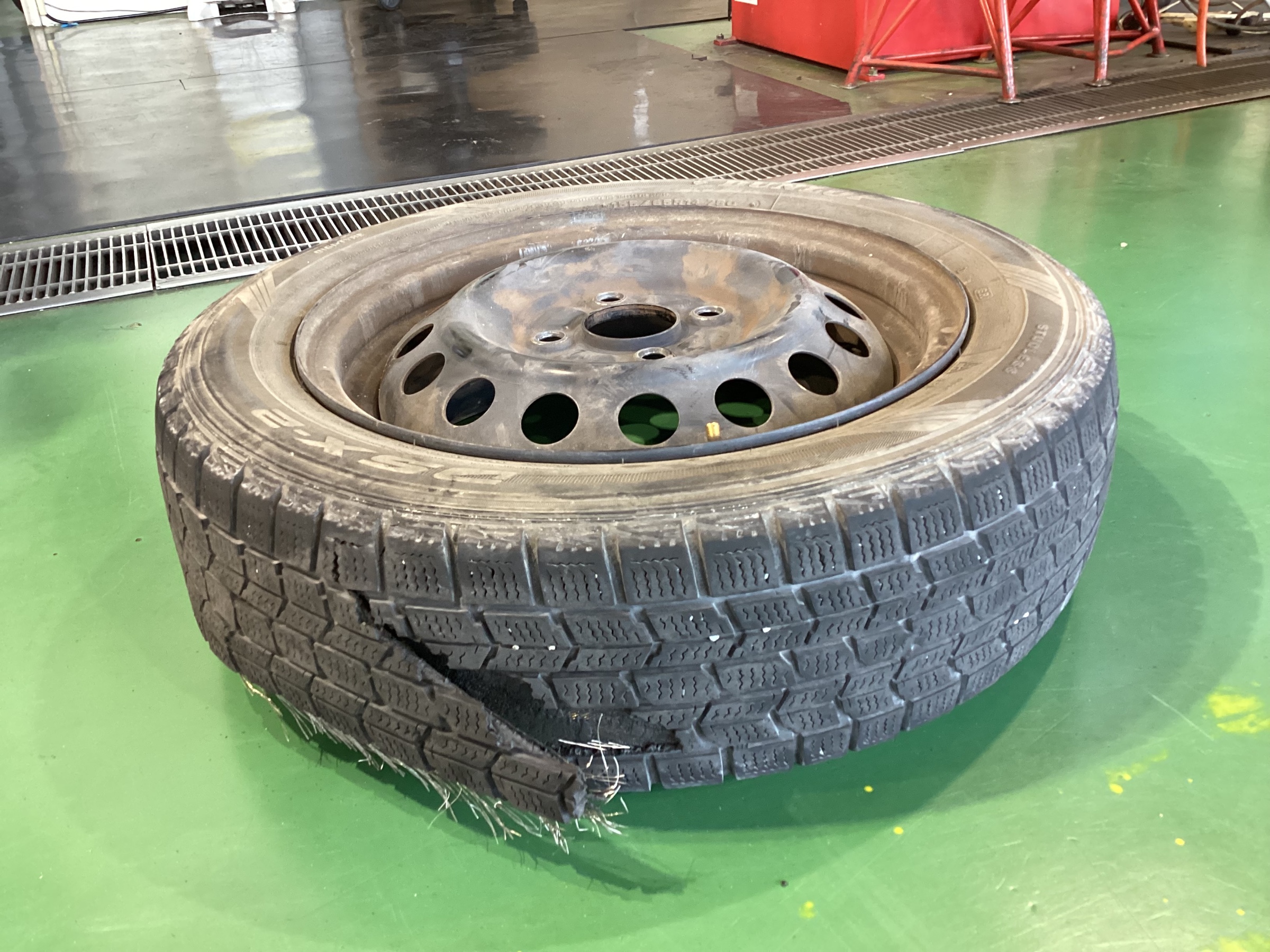 下の写真は、接地面のヒビからバーストしてしまったタイヤです。