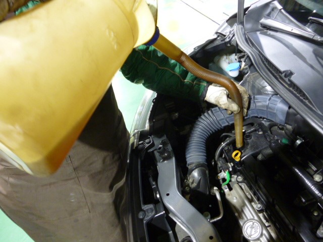 エンジンオイル給油口よりオイルを注入し、エンジン始動後に2名体制でオイルエレメント周りからの漏れ確認、オイルゲージでの適量確認、給油口のキャップ(オイルフィラーキャップ)の締め付け確認を行なって終了です。